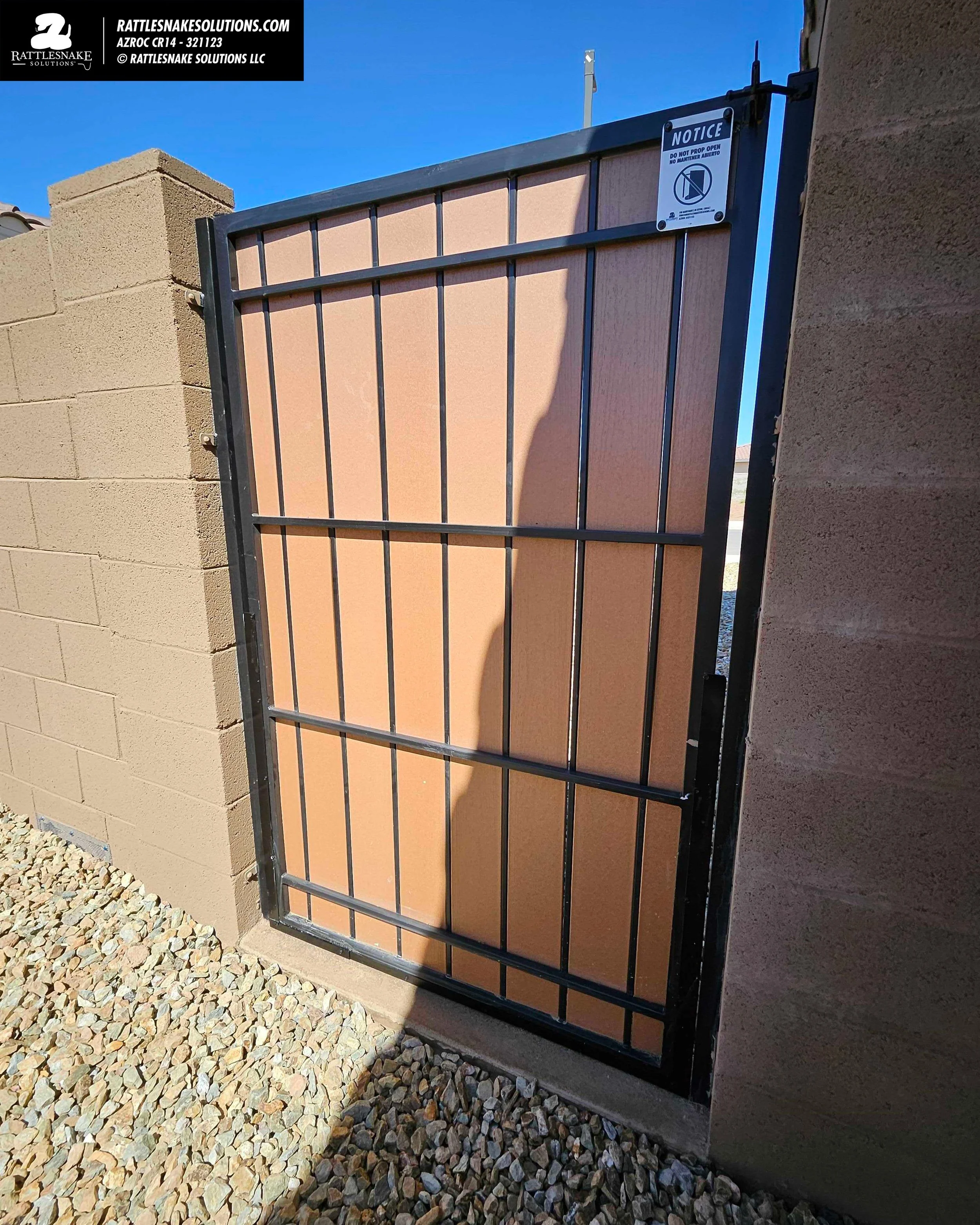 This gate has been modified to prevent rattlesnakes of any age and size from entering the backyard. Combined with other changes to the outer perimeter, this year will be less stressful for this family than it was.